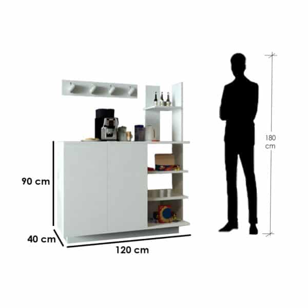 يتميز ركن القهوة بتصميم متقن يتكون من درفتان وأربعة أرفف مفتوحة، مما يوفر مساحة كافية لعرض مجموعتك من مستلزمات القهوة بطريقة منظمة وجميلة.