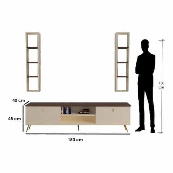 استمتع بتحويل منزلك إلى مساحة عصرية وجميلة مع طقم الطاولات، الذي يجمع بين اللون البيج واللون البني الدافئ. يتكون الطقم من طاولة تلفزيون ووحدتين جداريتين مع 4 أرفف لكل منها، وركن القهوة بالإضافة إلى طاولة قهوة تقدم لك مزيجًا مثاليًا بين الجمالية والوظائف المتعددة.