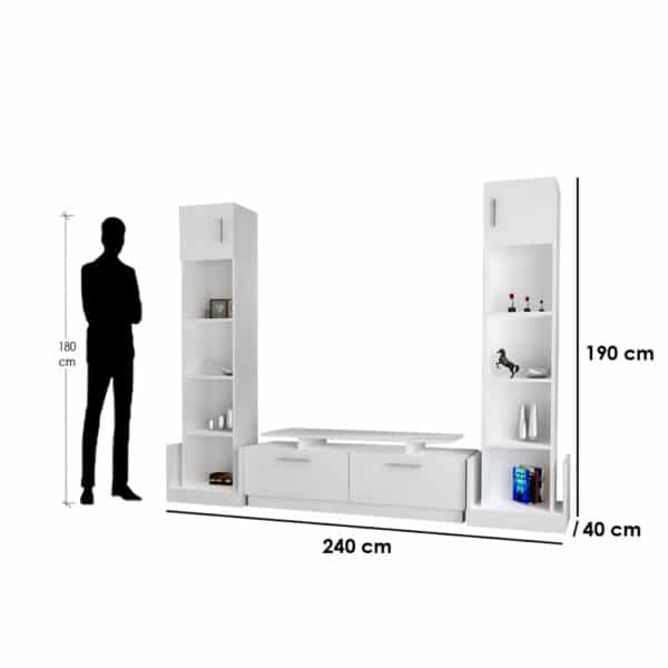 | المقاسات | العمق : 40 سم العرض : 240 سم الإرتفاع : 190 سم ارتفاع المكان المخصص للشاشة / 60 سم عرض الطاولة الوسطى / 140 سم عرض المكان المخصص للشاشة / 120 سم عرض الدولاب الجانبي/ 50 سم لكل دولاب |